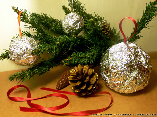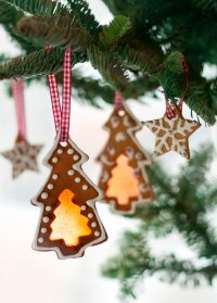-Κόψε χαρτόνι σε σχήμα αστεριού, καμπάνας κ.ά. Καλύψε την επιφάνεια τους με κόλλα και πασπάλισέ τα με χρυσόσκονη ή σε χάντρες. Στη συνέχεια τρυπήσέ τα στο πάνω μέρος και πέρνα κλωστή, σχοινάκι ή κορδέλα για να τα κρεμάσεις.